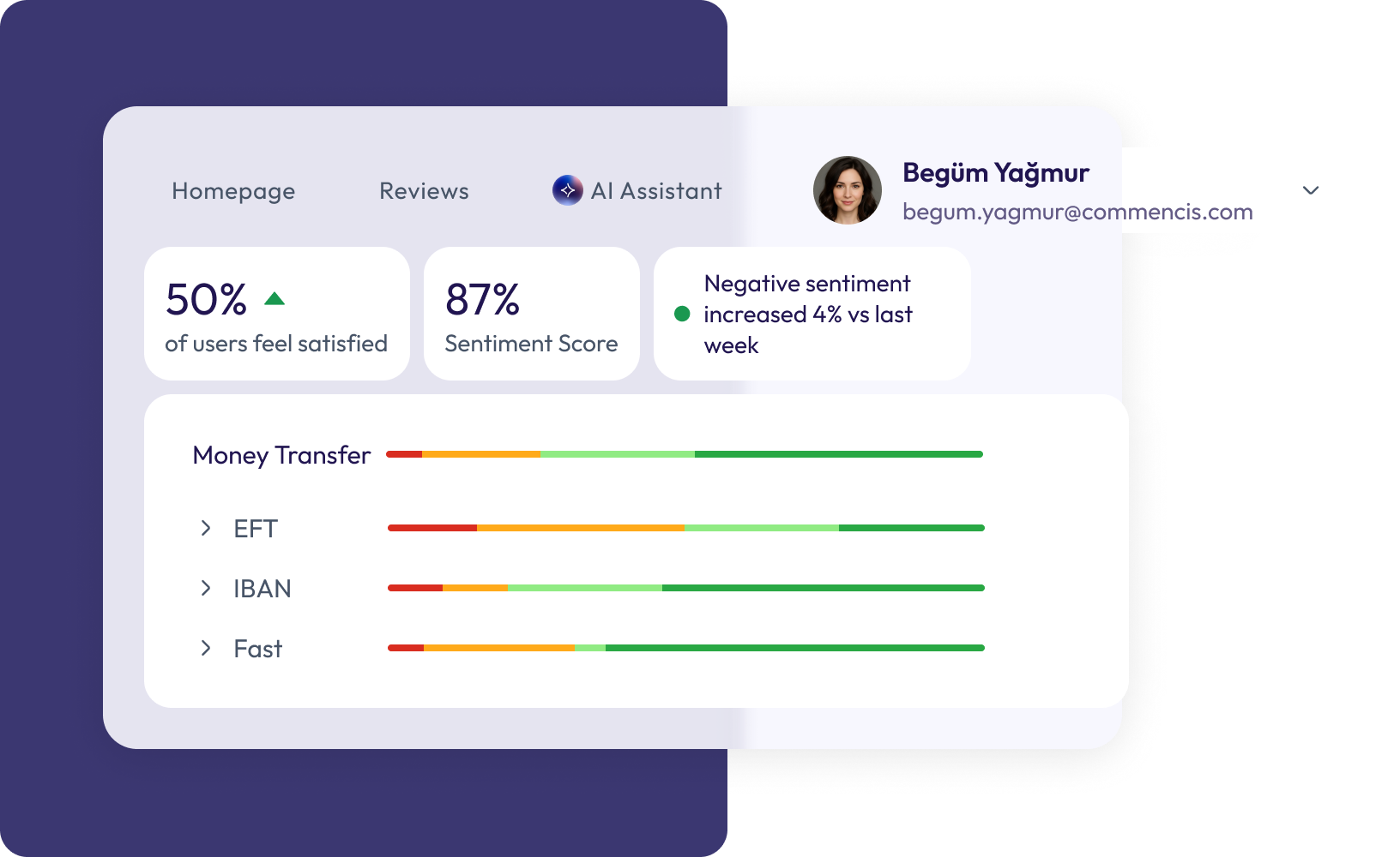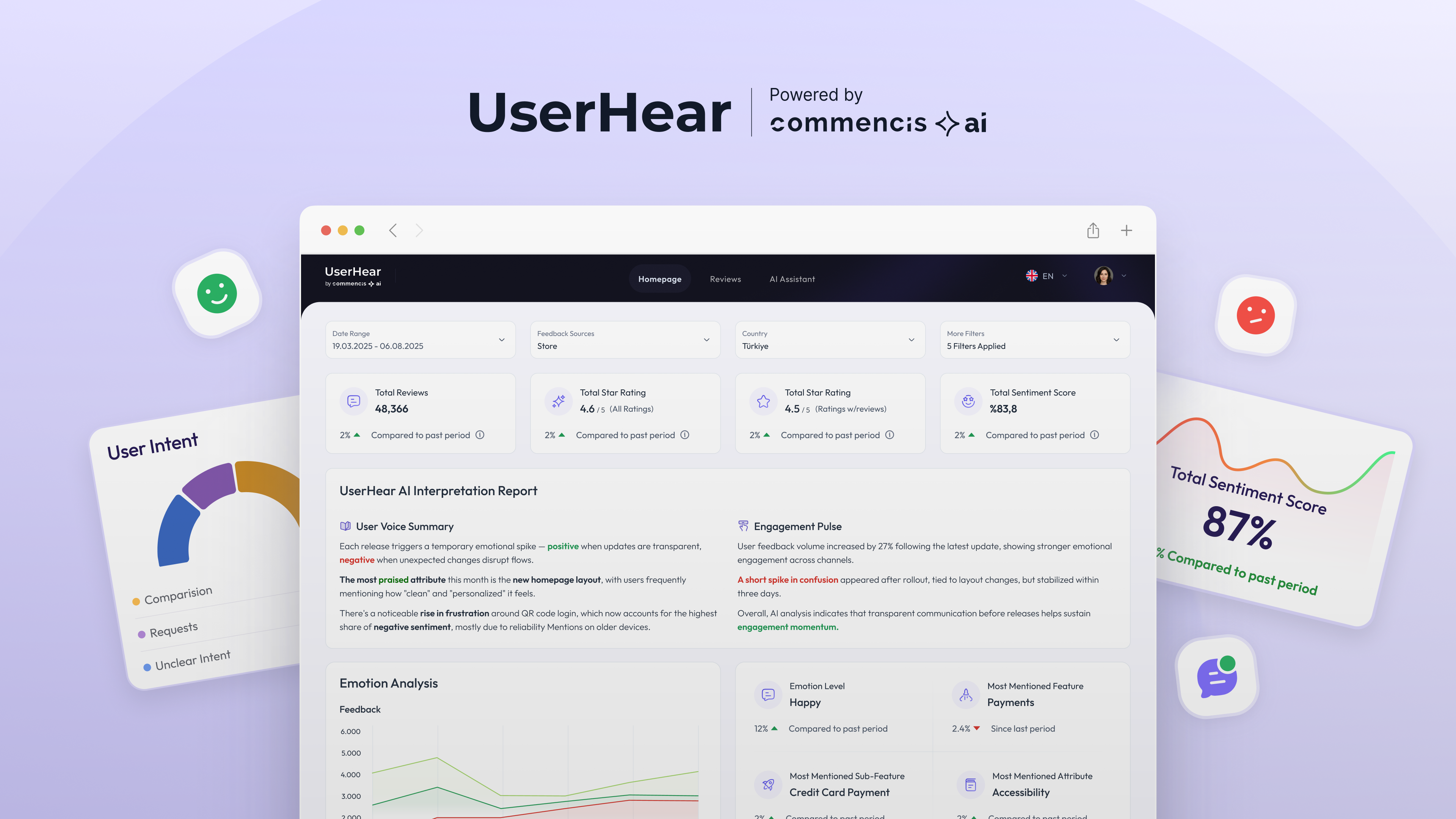 Receive a detailed AI-powered report analyzing your user reviews, sentiment trends, key issues and improvement opportunities; all in one place.